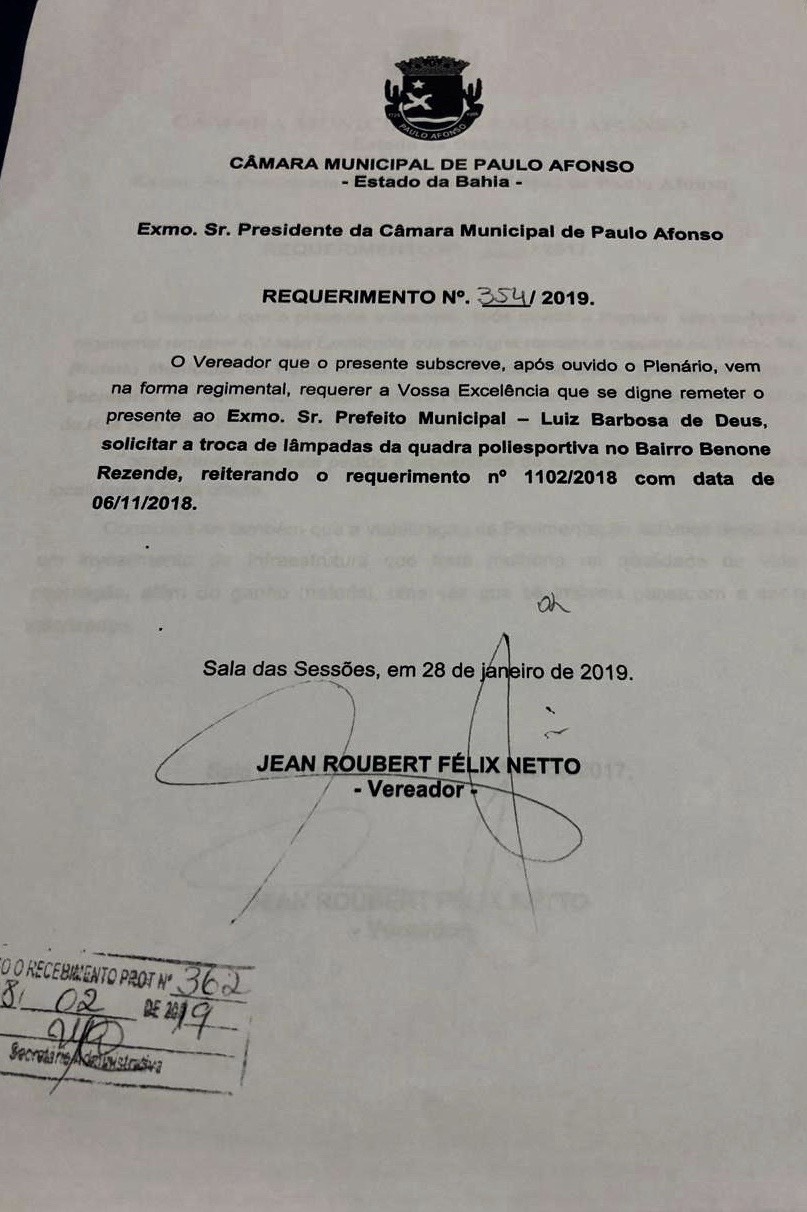 Através do requerimento 354/2019 o vereador Jean Roubert solicitou a troca de lâmpadas da Quadra Poliesportiva do Benone Rezende. Essa solicitação é uma reiteração do ano de 2018, como mostra a imagem abaixo.