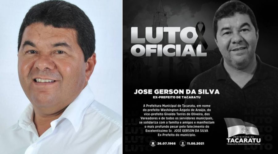 “Hoje, 11 de agosto de 2021, nos despedimos do Ex – Prefeito do Município de Tacaratu, José Gerson da Silva, nascido no dia 26 de Julho de 1966, no sítio Malhada do saco, filho de Joaquina e Zé de Santa (in memorian), esposo de Diva de Souza Carvalho e pai de Gerson Junior. Gerson, sempre residiu no distrito de Caraibeiras, começou a trabalhar ainda na infância, sempre foi uma pessoa sonhadora e nunca desistiu dos seus sonhos, amante do futebol. Artesão, empresário e ex-prefeito do município, deixou um legado marcante para todos nós. Que descanse em paz, que Deus conforte todos os familiares e amigos!”