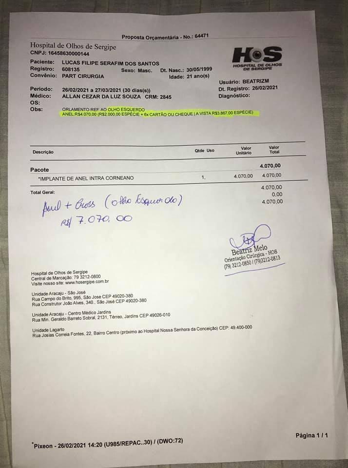 O jovem precisa fazer um procedimento de córnea que custa mais de R$ 14 mil e a família não tem condições de pagar. Para tentar arcar com esses custos, ele está fazendo uma vaquinha on-line e, no momento, precisa muito de sua ajuda.