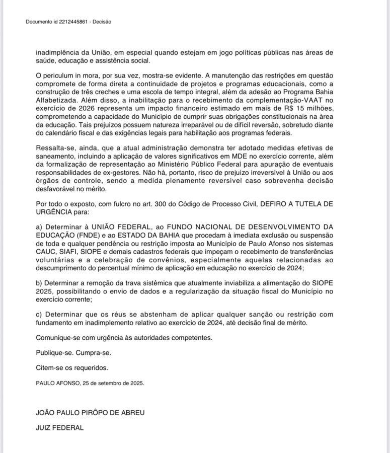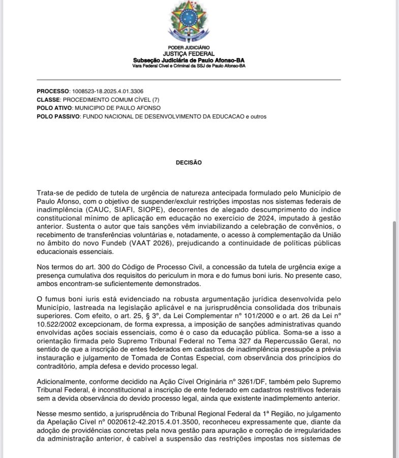 A Justiça Federal em Paulo Afonso concedeu tutela de urgência para excluir o município de cadastros federais de inadimplência, garantindo o acesso a convênios e transferências voluntárias na área da educação. A decisão, assinada pelo juiz federal João Paulo Pirôpo de Abreu, determina que a União, o Fundo Nacional de Desenvolvimento da Educação (FNDE) e o Estado da Bahia removam imediatamente as restrições nos sistemas CAUC, SIAFI e SIOPE, que haviam sido impostas em razão do suposto descumprimento do índice mínimo de aplicação em educação no exercício de 2024.