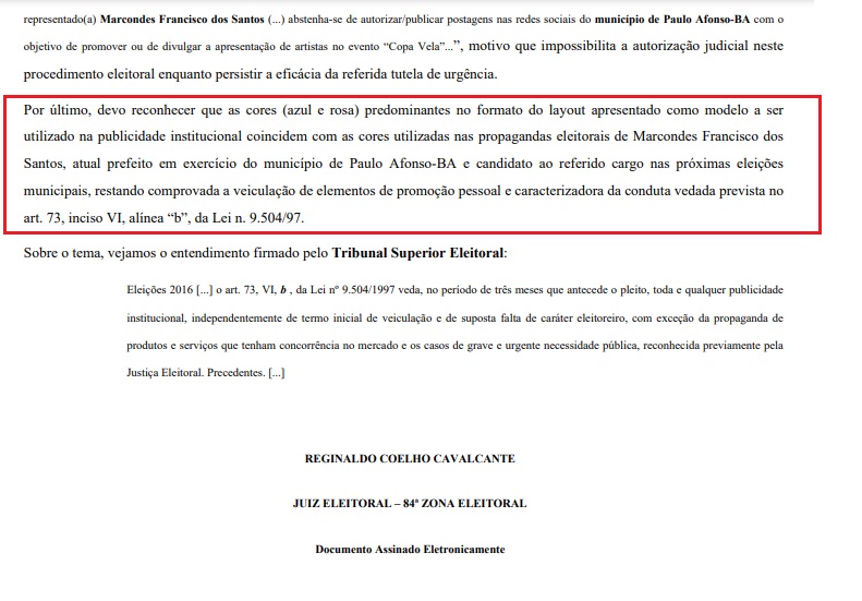 “Por último, devo reconhecer que as cores (azul e rosa) predominantes no formato do layout apresentado como modelo a ser utilizado na publicidade institucional coincidem com as cores utilizadas nas propagandas eleitorais de Marcondes Francisco dos Santos, atual prefeito em exercício do município de Paulo Afonso-BA e candidato ao referido cargo nas próximas eleições municipais, restando comprovada a veiculação de elementos de promoção pessoal e caracterizadora da conduta vedada prevista no art. 73, inciso VI, alínea ‘b’, da Lei n. 9.504/97.” — decidiu Reginaldo Coelho Cavalcante, juiz eleitoral.