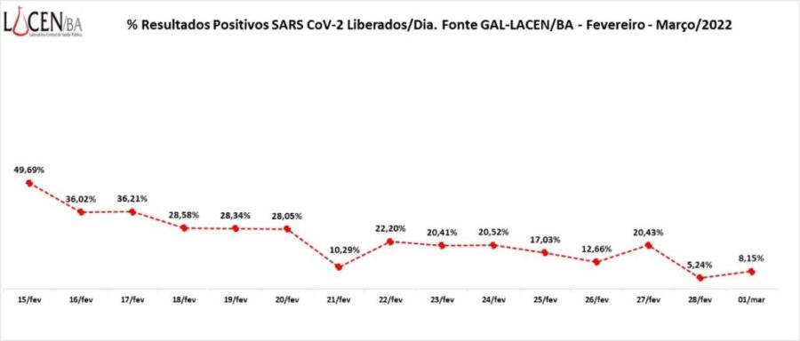 O Laboratório Central da Bahia (Lacen-BA) registrou um declínio consistente no percentual de amostras positivas para a Covid-19. Há 15 dias, a cada 100 amostras analisadas, 49,69 eram positivas; agora o número caiu para 8,15.