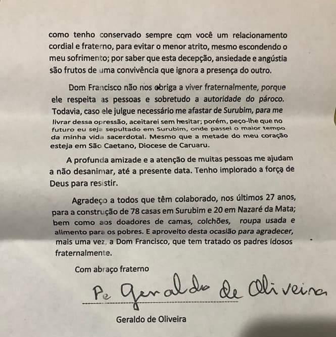 “A profunda amizade e atenção de muitas pessoas me ajudaram a não desanimar, até a presente data. Tenho implorado força de Deus para resistir. Agradeço a todos que têm colaborado nos últimos 27 anos para construção de 78 casa em Surubim, 20 em Nazaré da Mata, bem como aos doadores de camas, colchões, roupa usada e alimentos para os pobres. E aproveito desta ocasião para agradecer, mais uma vez, a Dom Francisco, que tem tratado os padres idosos fraternalmente”, finalizou a correspondência assinada de punho pelo religioso.