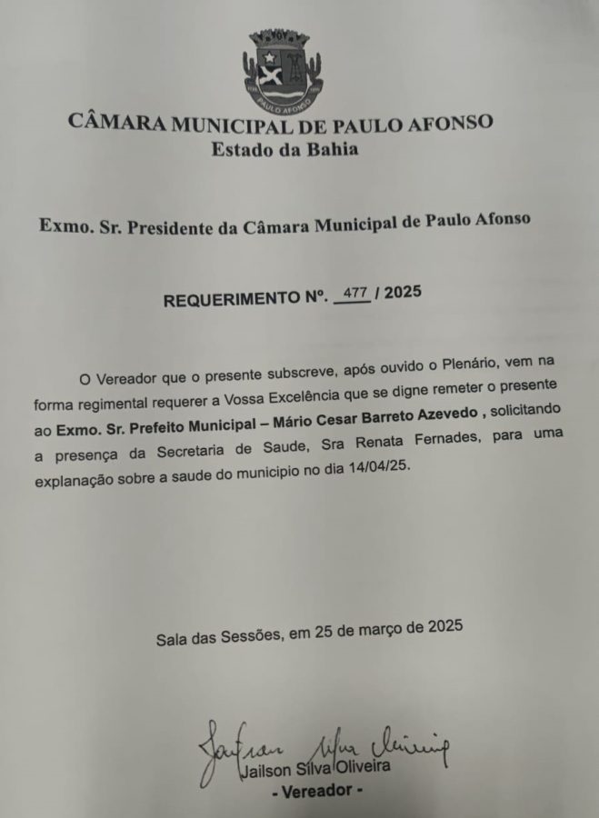 O vereador líder da bancada de oposição, Jailson Oliveira (PP) apresentou nesta segunda-feira (31) o Requerimento 477, solicitando a presença da secretária municipal de Saúde, Renata Fernandes, para uma explanação no plenário da Câmara Municipal de Paulo Afonso, no dia 14 de abril. O convite tem como objetivo esclarecer diversos pontos sobre o estado da Saúde no município.