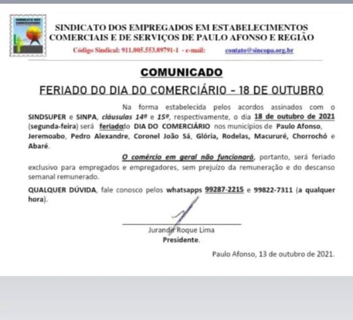 Segundo o Sindicato dos Empregados em Estabelecimentos Comerciais e de Serviços de Paulo Afonso e Região – SINCOPA, o dia 18 de outubro de 2021 será feriado do Dia do Comerciário nos municípios de Paulo Afonso, Jeremoabo, Pedro Alexandre, Coronel João Sá, Glória, Rodelas, Macururé, Chorrochó e Abaré.
