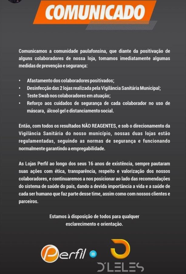 As 𝐋𝐨𝐣𝐚𝐬 𝐏𝐞𝐫𝐟𝐢𝐥 que em breve serão 𝐃’𝐋𝐞𝐥𝐞𝐬, pautadas na ética, transparência e coerência, se fez necessário abrir este comunicado, para informar a comunidade paulafonsina, que diante da positivação de alguns colaboradores de nossa loja, tomamos imediatamente algumas medidas de prevenção e segurança para os nossos colaboradores e clientes, tais como: