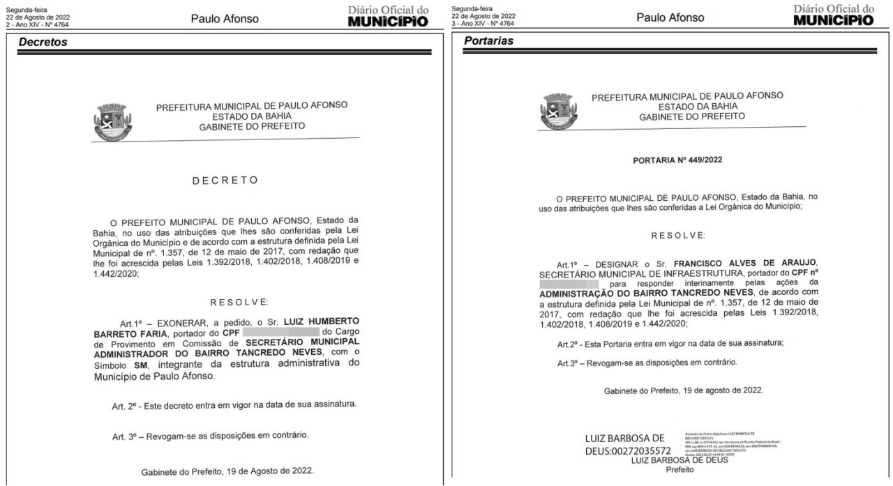 Luiz Humberto, conhecido como “Luizinho”, pediu exoneração do cargo de Administrador do Bairro Tancredo Neves. A informação foi publicada nas redes sociais da pefeitura de Paulo Afonso na tarde desta segunda-feira, 22 de agosto. De acordo com a publicação, Luizinho deixa o governo por questões pessoais. Luiz Humberto é genro do prefeito Luiz de Deus (PSD) e pai de Luiza de Deus (PP) que é candidata a deputada estadual. Veja abaixo nota oficial: