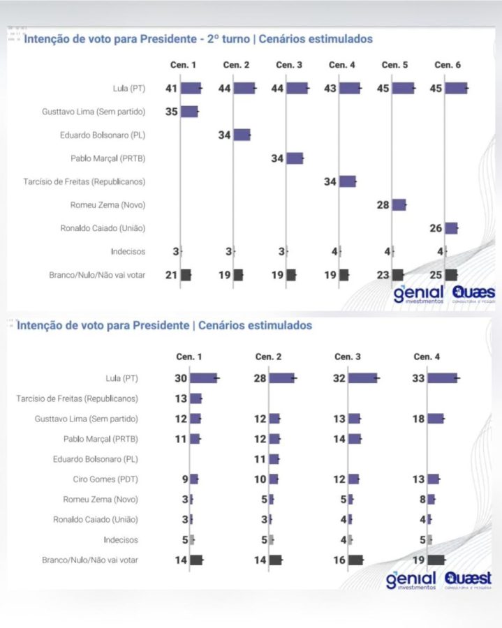 A pesquisa aponta que Lula teria 41% das intenções de voto contra 35% de Gusttavo Lima. O cantor, que ainda não se filiou a nenhum partido político, ganhou destaque no início de janeiro, quando declarou sua intenção de se lançar como candidato à presidência. Sua entrada no cenário político gerou surpresa em seu círculo político, especialmente entre apoiadores do ex-presidente Jair Bolsonaro (PL), que recebeu o apoio do sertanejo nas últimas eleições, e também no governador de Goiás, Ronaldo Caiado (União Brasil), que inicialmente tentava emplacar Gusttavo Lima como candidato ao Senado.
