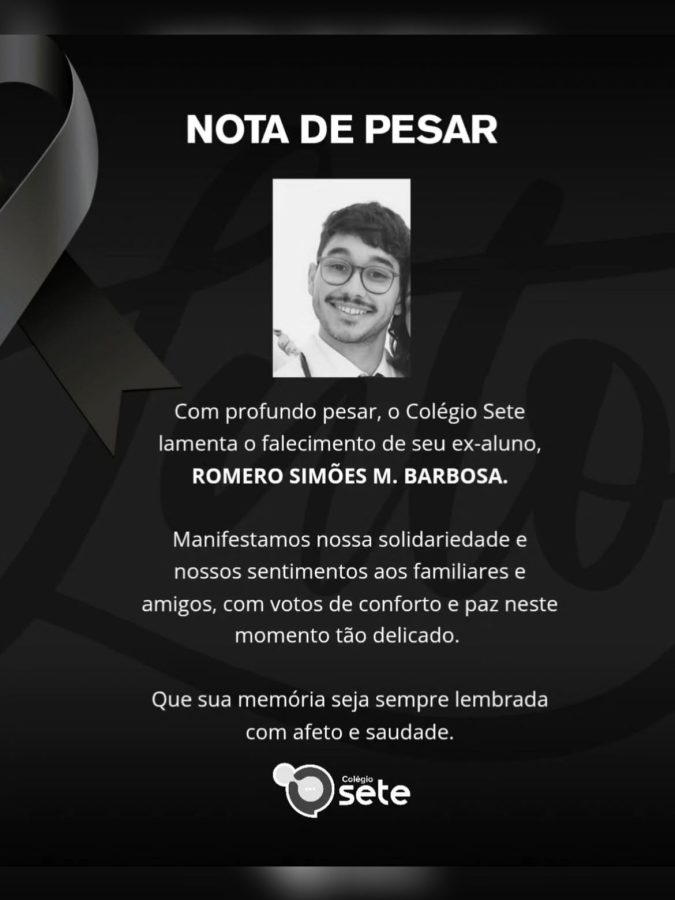 Também por meio de nota, o Colégio Sete de Setembro, de Paulo Afonso, onde Romerinho foi aluno, lamentou profundamente a perda. “Com profundo pesar, o Colégio Sete lamenta o falecimento de seu ex-aluno, Romero Simões M. Barbosa”, diz o comunicado. A escola manifestou solidariedade aos familiares e amigos, com “votos de conforto e paz neste momento tão delicado”, acrescentando ainda: “Que sua memória seja sempre lembrada com afeto e saudade”.