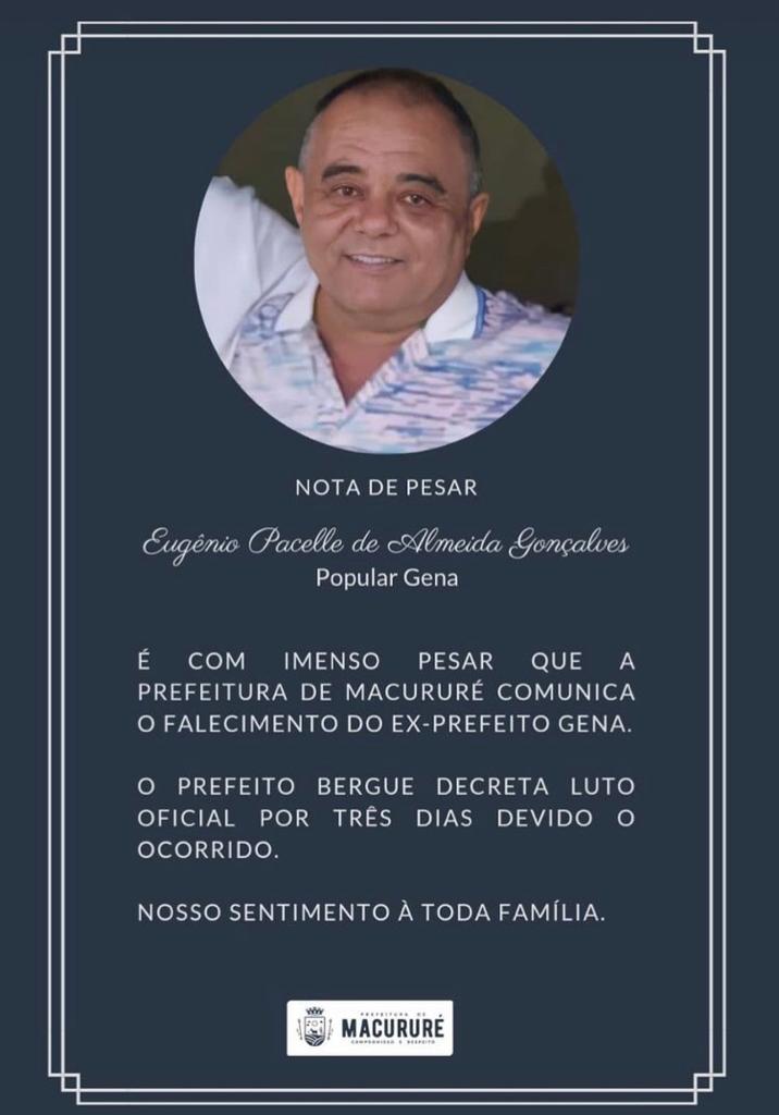 Em nota de pesar, o prefeito Bergue de Josias decretou luto oficial de três dias no município. “É com imenso pesar que a prefeitura de Macururé comunica o falecimento do ex-prefeito Gena. O prefeito Bergue decreta luto oficial de três dias devido ocorrido. Nosso sentimento à família.”