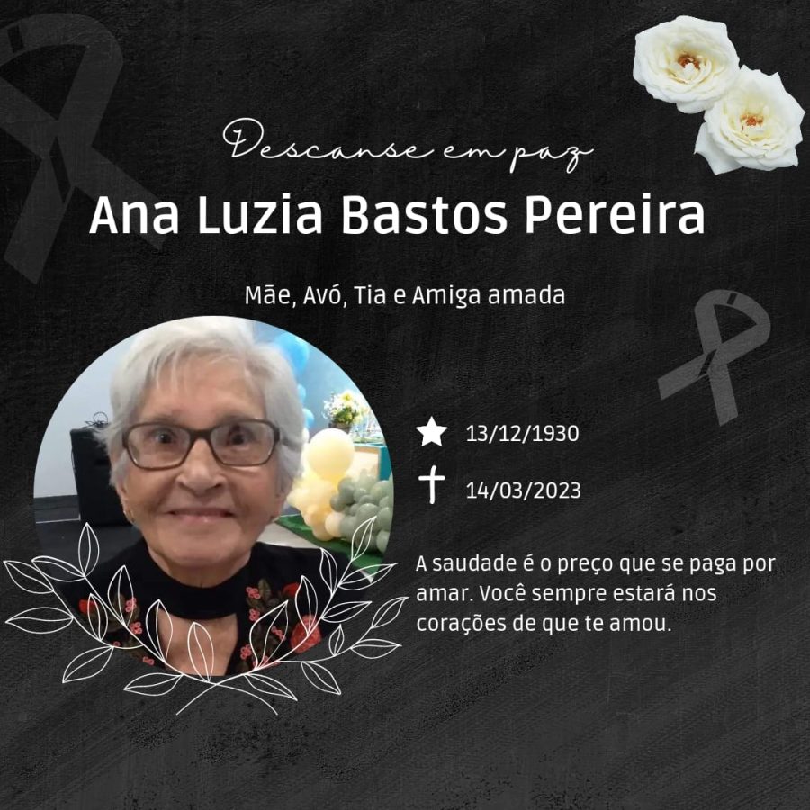 Faleceu nesta terça-feira, 14 de março, aos 92 anos, a senhora Ana Luzia Bastos Pereira, mãe do ex-prefeito Anilton Bastos e do engenheiro Wilson Pereira.