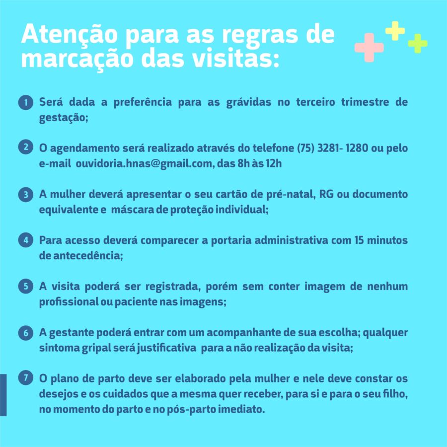 Ela enfatiza que a visita pode ser agendada por mulheres no terceiro trimestre de gravidez por meio do telefone (75) 3281-1280 ou pelo e-mail ouvidoria.hnas@gmail.com, no horário de 8h às 12h. A gestora ressalta ainda que durante o parto, as gestantes terão direito a acompanhante, prática que foi suspensa devido a alta contaminação pela covid-19. “Aqui garantimos o direito a acompanhante, porém foi suspenso durante a fase mais crítica da covid porque o índice de contaminação estava altíssimo”, ressalta.