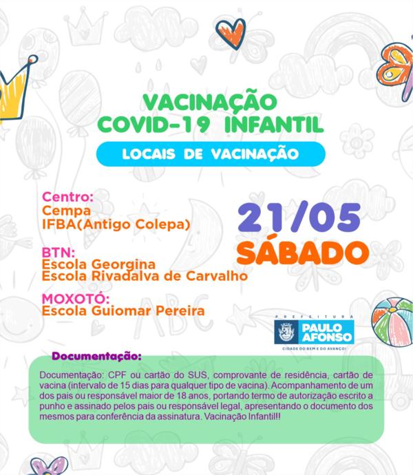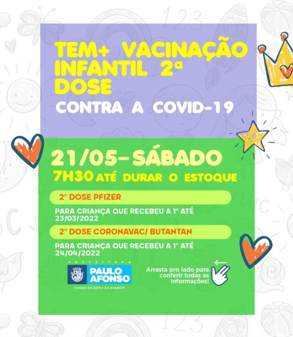 Mais uma etapa de 2ª dose da vacina infantil será realizada neste sábado (21). A imunização será para as crianças que tomaram a 1ª dose da Pfizer até 23 de março e que receberam a 1ª dose da Coronavac/ Butantan até 24 de abril.