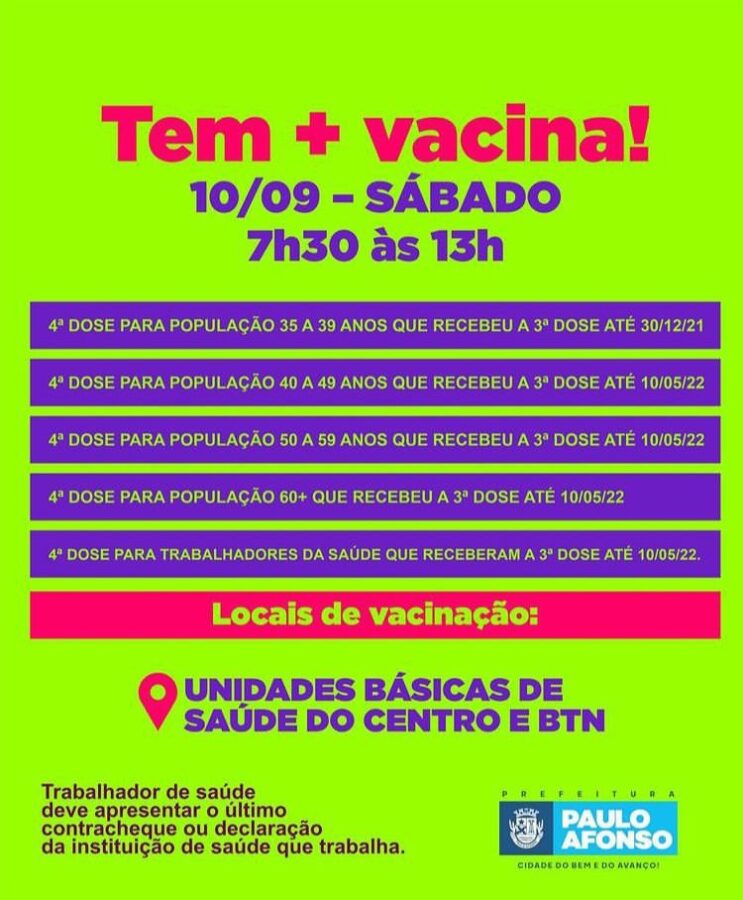 Nos locais serão aplicadas a 4ª dose para população de 35 a 39 anos que recebeu a 3ª até 30/12/21, 4ª dose para população de 40 a 49 anos que recebeu a 3ª até 10/05/22, 4ª para a população de 50 a 59 anos que recebeu a 3ª até 10/05/22, 4ª para população 60+ que recebeu a 3ª até 10/05/22 e 4ª dose para trabalhadores da saúde que receberam a 3ª até 10/05/22.
