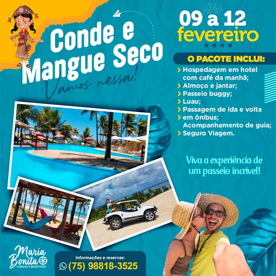 Na estação mais caliente do ano, a Maria Bonita Turismo, vai te levar ao Conde e a Mangue Seco. Iremos nos hospedar em hotel pé na areia para aproveitarmos bem o verão. Saindo de lá, pegaremos uma escuna com destino a uma península que serviu de cenário da novela global Tieta do Agreste, baseada em uma obra de Jorge Amado.