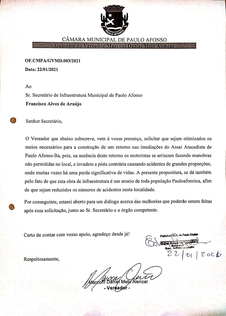 O vereador Marconi Daniel (PODEMOS) protocolou nesta sexta-feira, 21, ofício na Secretaria de Infraestrutura da Prefeitura de Paulo Afonso solicitando a viabilização da construção de um retorno nas proximidades do Atacadista do município. Para o parlamentar, hoje o local é como “uma tragédia anunciada”, por conta dos riscos de acidentes, atropelamentos e infrações que os motoristas acabam ficando vulneráveis. O problema se dá devido à falta de planejamento de trânsito da atual gestão municipal.