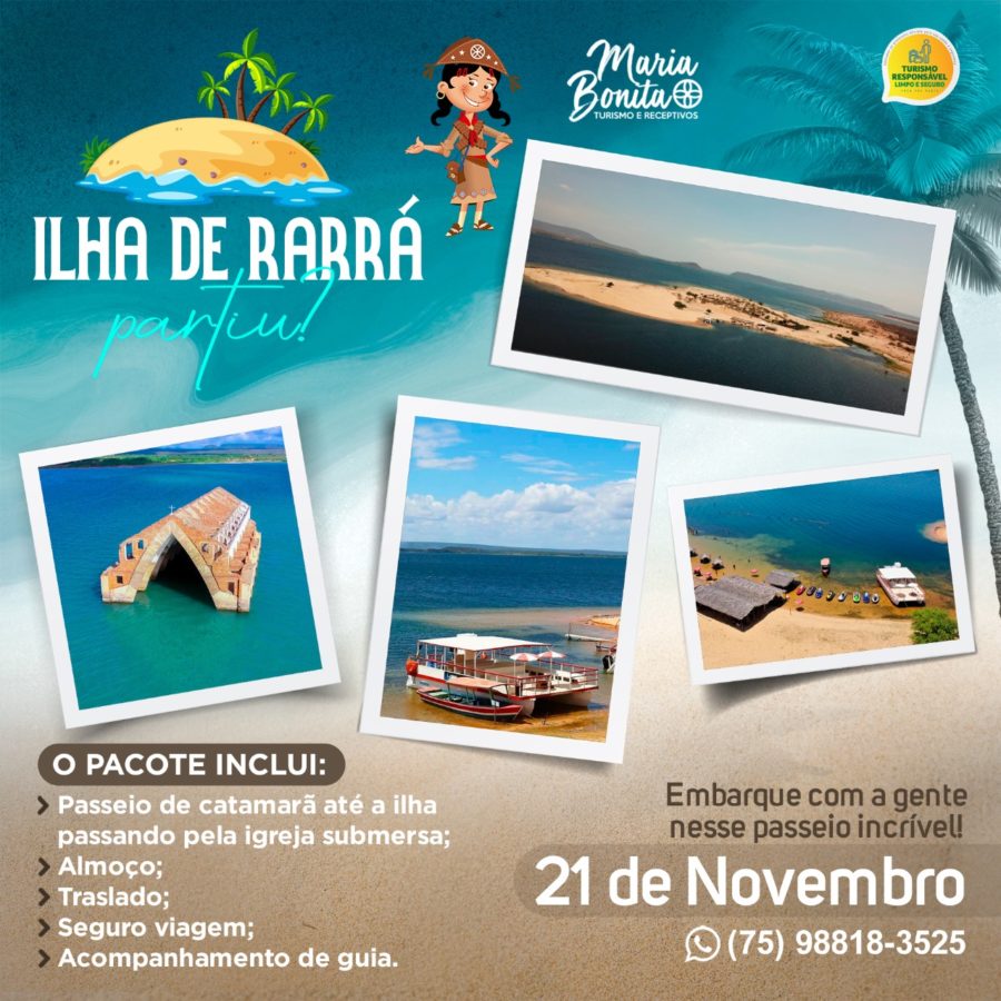 Haverá uma excursão da qual partirá da Maria Bonita Turismo em transporte com ar-condicionado, com toda a galera rumo a Petrolândia, chegando lá, os participantes embarcarão no catamarã até a ILHA DE RARRÁ, os mesmos, desvendarão e desbravarão as belezas da ilha mais famosa do sertão.