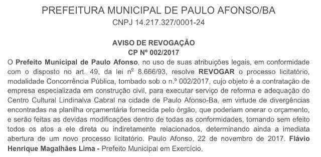 Em setembro de 2017 eu já havia feito uma publicação denunciando o atraso, e até então, sequer existe previsão de entrega, pois houve um processo licitatório (segue imagem abaixo) na época e três meses após, a licitação foi revogada (segue imagem abaixo).