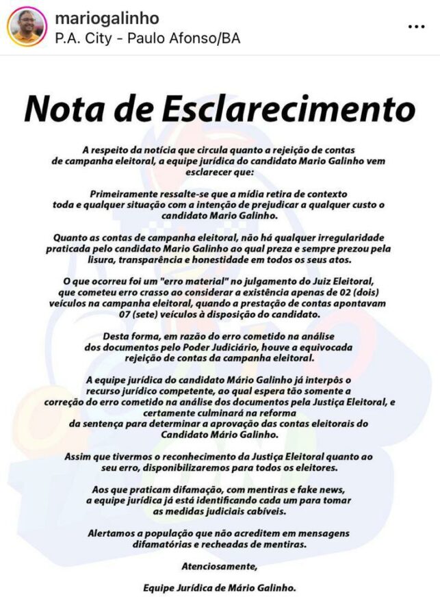 “A respeito da notícia que circula quanto a rejeição de contas de campanha eleitoral, a equipe jurídica do candidato Mario Galinho vem esclarecer que: