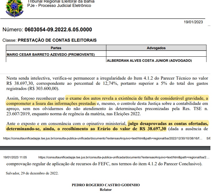 O ex-vereador e candidato a deputado estadual Mário Galinho (PSDB) teve suas contas de campanha eleitoral de 2022 desaprovadas em decisão do desembargador Pedro Rogério Castro Godinho, relator do caso no Tribunal Regional Eleitoral da Bahia. Conforme a decisão, houve irregularidades nos gastos com combustível.