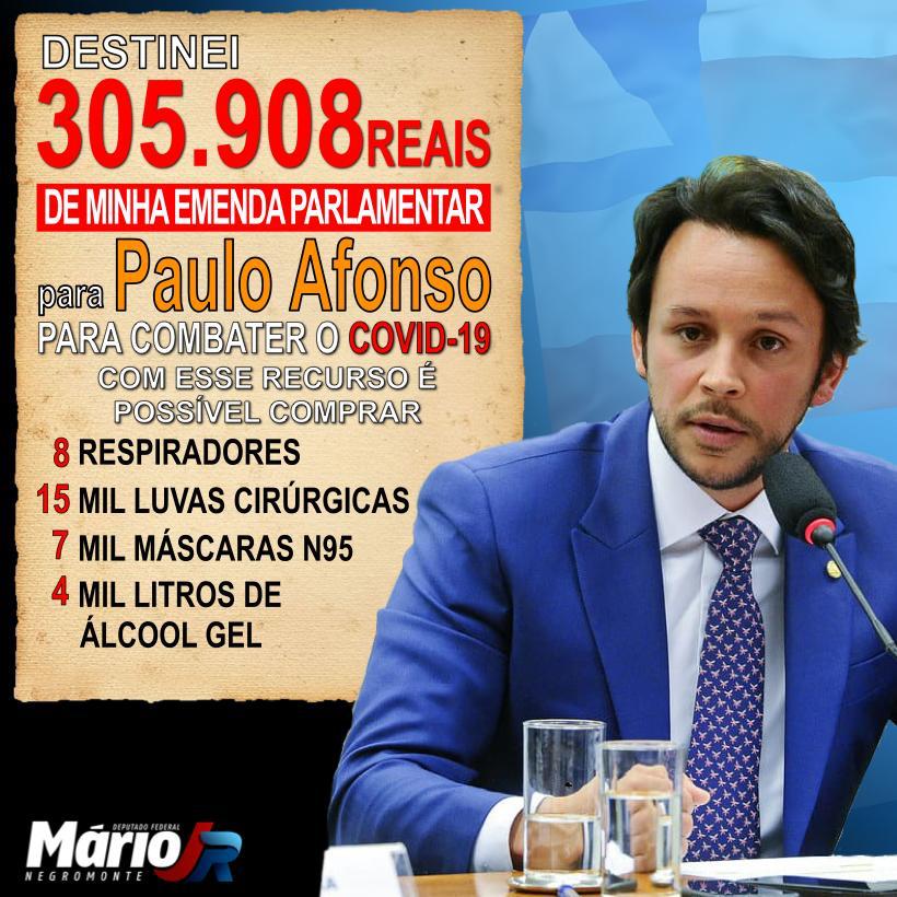 Paulo Afonso será uma das cidades contempladas com valor de R$ 305.908,00 (trezentos e cinco mil, novecentos e oito reais) suficientes para adquirir 08 respiradores, 15 mil luvas cirúrgicas, 7 mil máscaras N95 e 4 mil litros de álcool em gel.