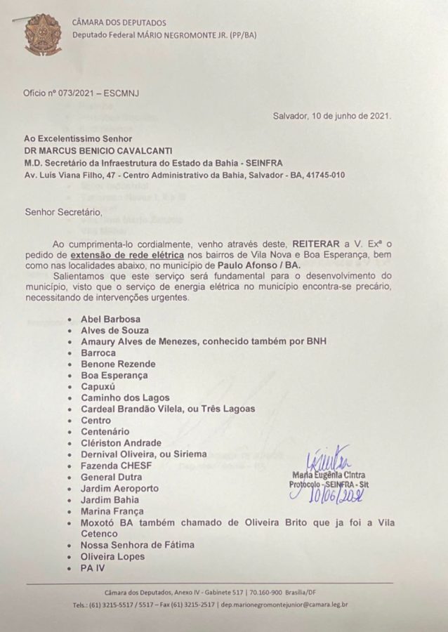 Em junho desse ano, Mário Negromonte Júnior protocolou o ofício de nº 073/2021 solicitando do titular da Seinfra, Marcus Benício, a extensão de rede elétrica para o Boa Esperança.