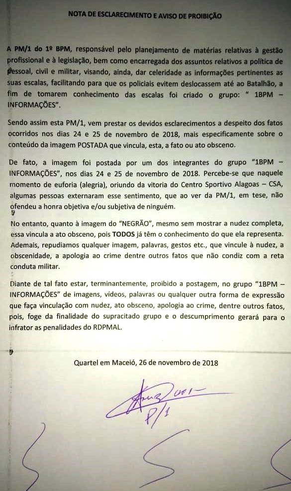 “Diante de tal fato estar [sic], terminantemente, proibido a postagem, no grupo ‘1BPM – INFORMAÇÕES’ de imagens, vídeos, palavras ou qualquer outra forma de expressão que faça vinculação com nudez, ato obsceno, apologia ao crime, dentre outros fatos, pois, foge da finalidade do supracitado grupo e o descumprimento gerará para o infrator as penalidades do RDPMAL”, conclui a nota.