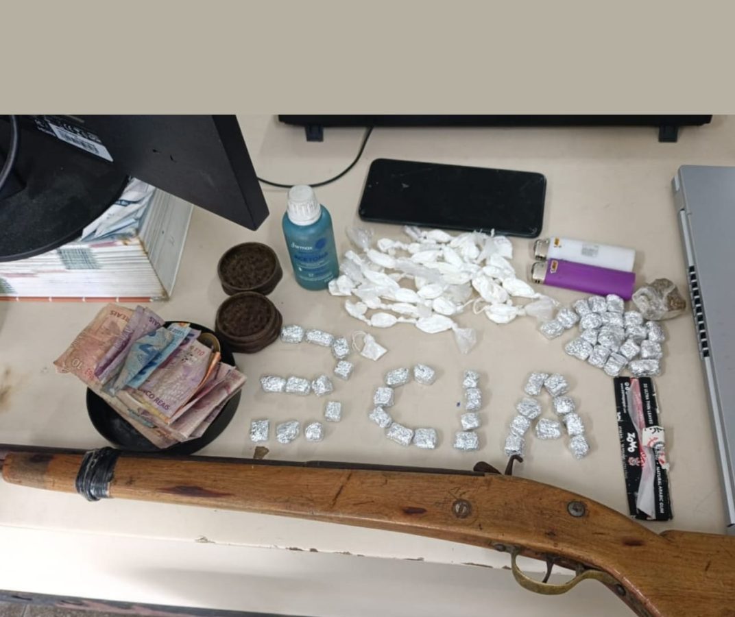 Durante a abordagem, foram encontrados com o suspeito R$ 134,00 em espécie, 49 tabletes de substância semelhante à maconha prontos para venda, um tablete inteiro de maconha, 49 trouxas de substância semelhante à cocaína, um aparelho celular, uma espingarda artesanal, um dichavador de maconha e um recipiente com chumbos.