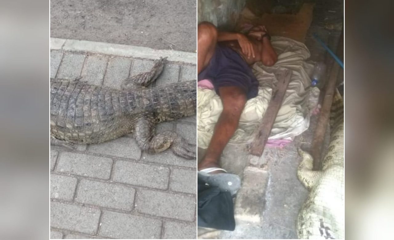 As imagens enviadas revelam o suposto autor deitado no local onde costuma passar a noite, ao lado do corpo do jacaré e de um pedaço de pau que pode ter sido utilizado no crime. 😢📸 “Esse local aí é onde o morador de rua dorme, ele dorme nesse buraco. E depois que ele matou, levou o jacaré para perto dele”, afirmou a testemunha.