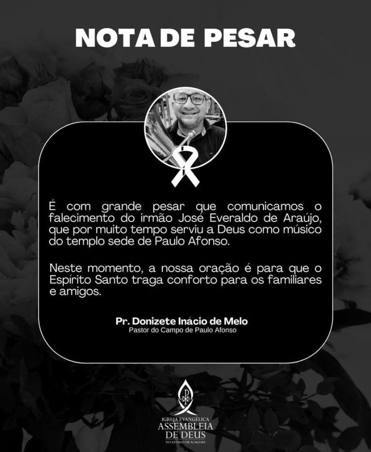 José Everaldo de Araújo, 59 anos, foi encontrado morto em sua residência nesta terça-feira (30). Membro ativo da Igreja Assembleia de Deus de Paulo Afonso, Everaldo era um dedicado músico instrumentista, sempre presente nas atividades da igreja.