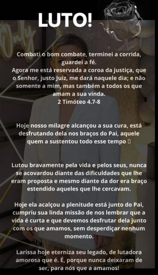Na última sexta-feira (7), Luiz Ricardo, esposo de Larissa Tiara, informou que Larissa estava na UTI em estado grave. Ele pediu orações. O povo orou, a vontade é Deus. Larissa era mãe de dois filhos.