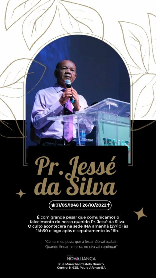 Foi com tristeza e pesar que a população de Paulo Afonso tomou conhecimento do falecimento do pastor e advogado Jessé da Silva, aos 74 anos, ocorrido nesta quarta-feira, 26 de outubro. Ele estava internado há aproximadamente um mês no Hospital da Bahia, em Salvador, para o tratamento de problemas renais. Infelizmente, morreu em decorrência de complicações após uma cirurgia.