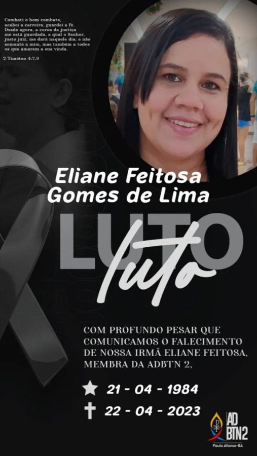 A Igreja Assembleia de Deus da cidade de Paulo Afonso está em luto. A notícia da morte da sua fiel integrante, Eliane Feitosa Gomes de Lima, que havia completado 39 anos na sexta-feira (21), levou comoção às redes sociais. Logo, diversas notas de pesar e mensagens de pêsames ganharam as redes sociais. Eliane residia na Rua São João, no BTN 3. Ela lutava contra um câncer de mama há cerca de dois e faleceu nesse sábado, dia 22.