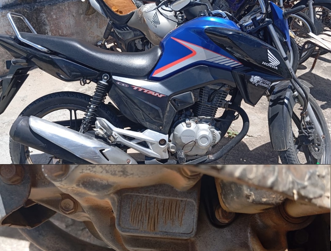 Ao realizar a verificação da motocicleta, foi constatada a adulteração dos sinais identificadores, com a numeração do chassi e do motor completamente suprimidas, impossibilitando sua identificação.