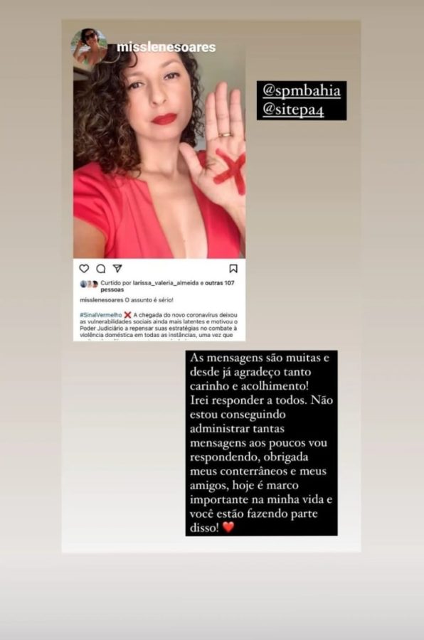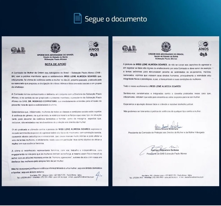 Em nota oficial publicada no perfil oficial no Instagram da Ordem dos Advogados do Brasil – Subseção Paulo Afonso (OAB – BA), na manhã deste domingo (6), a Comissão da Mulher da referida entidade, manifestou publicamente apoio e solidariedade a Miss Lene Almeida Soares, que, de acordo com o texto, infelizmente, foi vítima de violência contra a mulher no dia 25 de fevereiro, praticada pelo ex-namorado que propiciou a divulgação de vídeos íntimos e fotos em redes sociais e em grupos de whatsapp.