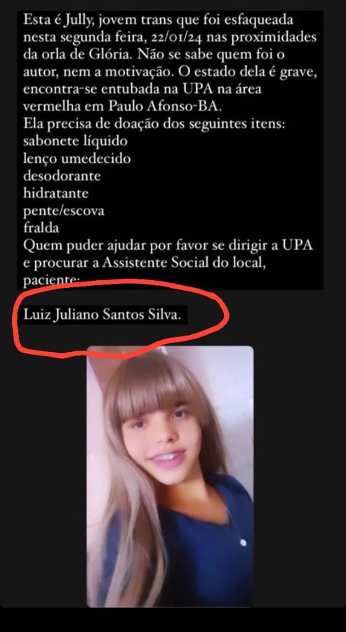 Na manhã de segunda-feira, 22 de janeiro, Juliana Santos, uma mulher transexual de 21 anos, residente no Conjunto Habitacional Dom Mário Zaneta, BTN 3, em Paulo Afonso, Bahia, foi vítima de uma brutal tentativa de homicídio nas proximidades da Orla da cidade de Glória, Bahia.