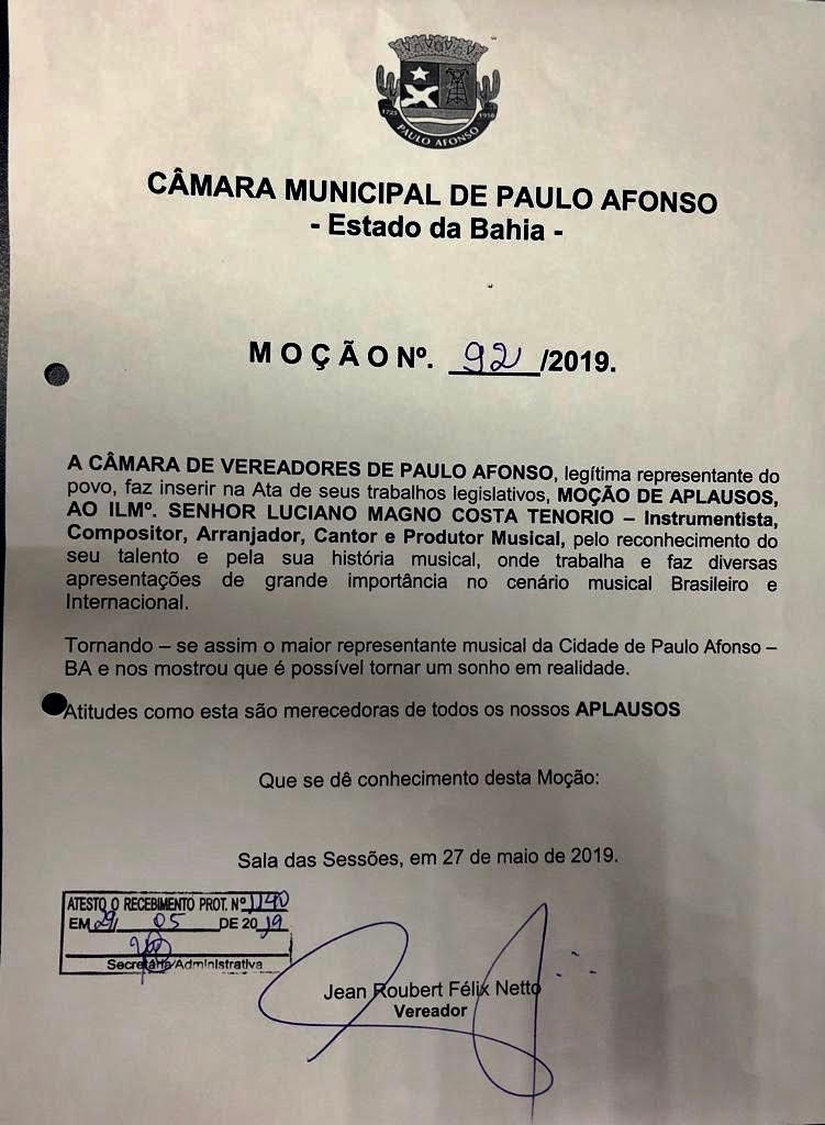 Aprovada por unanimidade na sessão ordinária desta segunda-feira, dia 10/06, Moção de Aplausos n° 92/2019, de autoria de Jean Roubert a LUCIANO MAGNO COSTA TENÓRIO – Instrumentista, Compositor, Arranjador, Cantor e Produtor Musical, pelo reconhecimento do seu talento e pela sua história musical, onde trabalha e faz diversas apresentações de grande importância no cenário musical brasileiro e internacional.