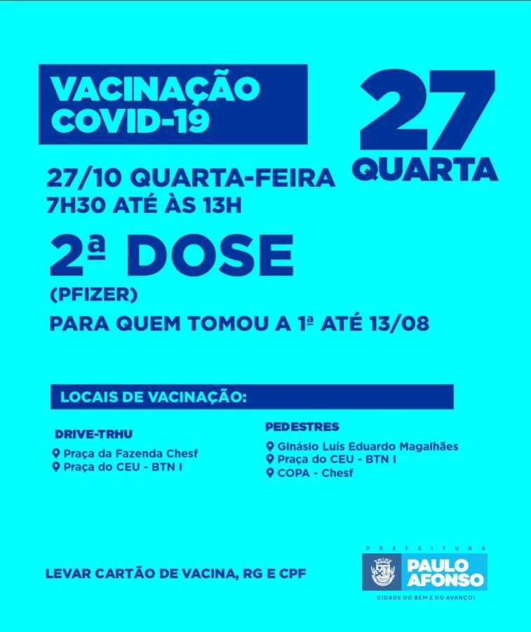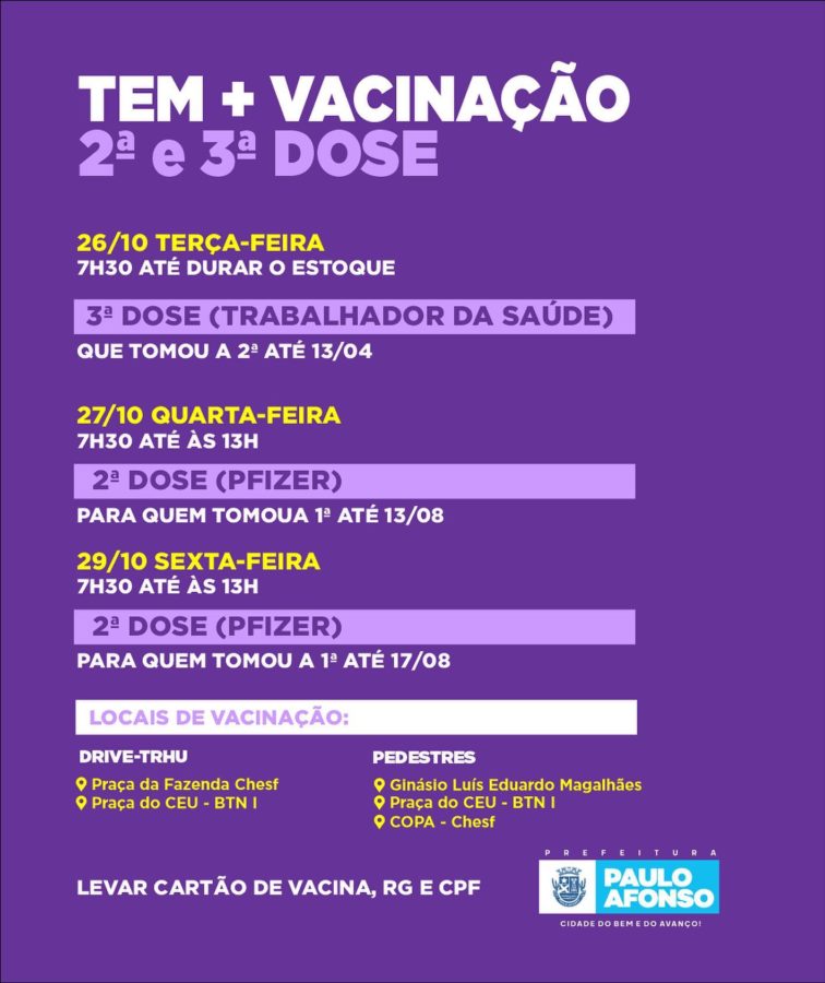 A vacinação contra a Covid-19 em Paulo Afonso segue e nesta semana terá aplicação de 2ª e 3ª dose. Nesta terça (26), a vacinação de 3ª dose é destinada para os trabalhadores da saúde que tomaram a 2ª dose até 13/04.