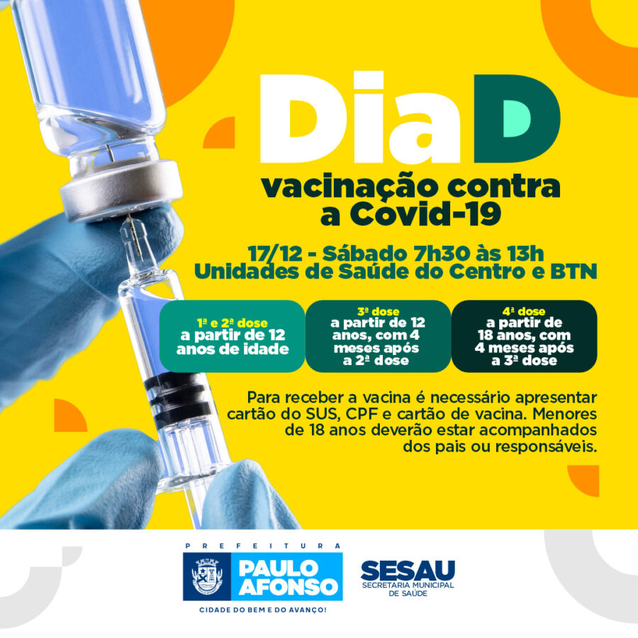 A vacinação será realizada nas Unidades Básicas de Saúde UBS`s do Centro e BTN, no horário das 7h30 às 13h, com a aplicação das 1ª e 2ª dose – a partir de 12 anos de idade; 3ª dose – a partir de 12 anos, com 4 meses após a 2ª dose e 4ª dose – a partir de 18 anos, com 4 meses após a 3ª dose.