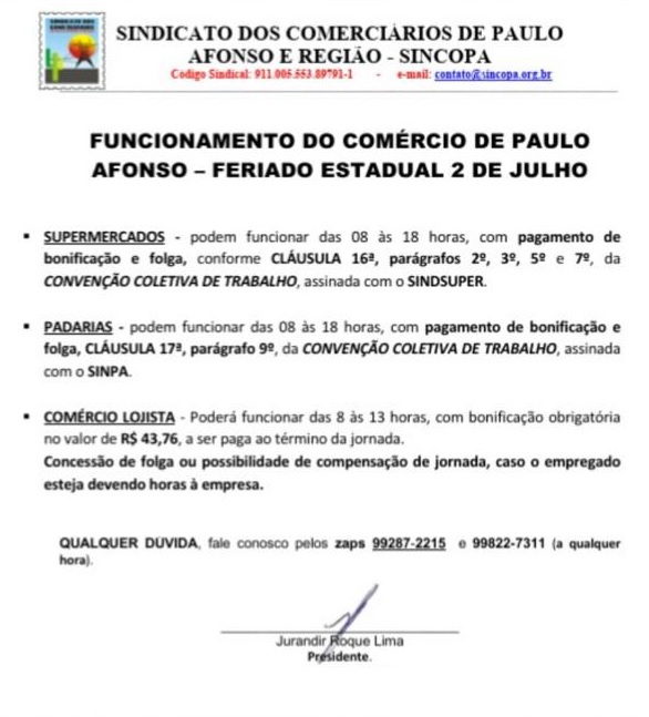 Os baianos têm feriado nesta sexta-feira (2) em comemoração à independência da Bahia. Confira o funcionamento dos estabelecimentos durante o feriado de 2 de julho em Paulo Afonso, segundo informações do Sincopa – Sindicato dos Comerciários de Paulo Afonso e Região. Confira abaixo: