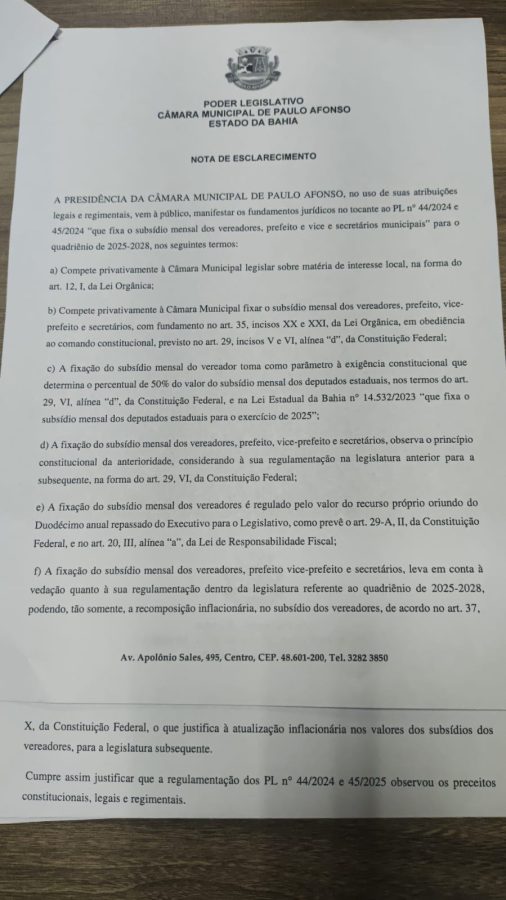 A presidência da Câmara Municipal de Paulo Afonso divulgou uma nota de esclarecimento para justificar os fundamentos jurídicos que embasam os Projetos de Lei nº 44/2024 e 45/2025, que fixam os subsídios de vereadores, prefeito, vice-prefeito e secretários municipais para o quadriênio 2025-2028.