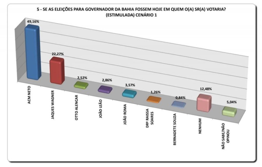 No primeiro cenário, ACM Neto aparece com 49,16% das intenções de voto, contra 22,27% de Wagner. Bem atrás dos dois, aparecem João Roma (Republicanos), ministro da Cidadania, com 3,57%; o vice-governador João Leão (PP), com 2,86%; o senador Otto Alencar (PSD), com 2,52%; Dra. Raíssa Soares (sem partido), com 1,26%; e a yalorixá Bernadete Souza (PSOL), com 0,84%. Responderam “nenhum”, 12,48% dos entrevistados, enquanto 5,04% não sabem ou não opinaram.