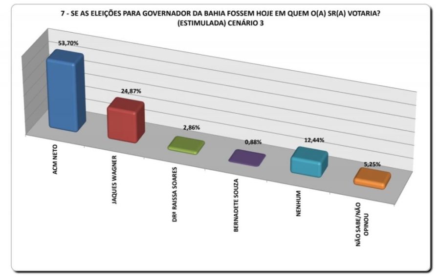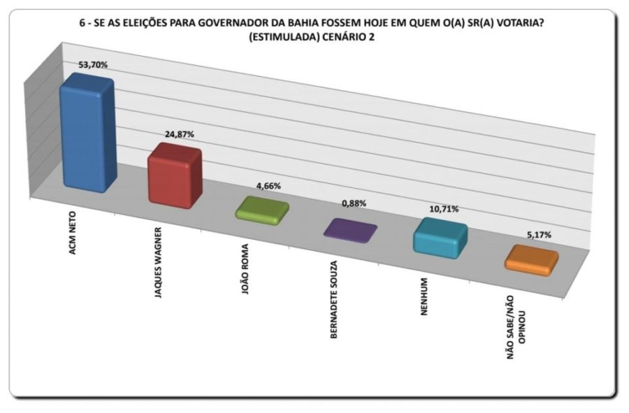 Em um segundo cenário, o ex-prefeito de Salvador aumenta sua vantagem e chega a 53,7% das intenções de voto, contra 24,87% de Jaques Wagner, 4,66% de João Roma e 0,88% de Bernardete Souza. “Nenhum” pontuou 10,71%, enquanto 5,17% não souberam responder ou não opinaram.