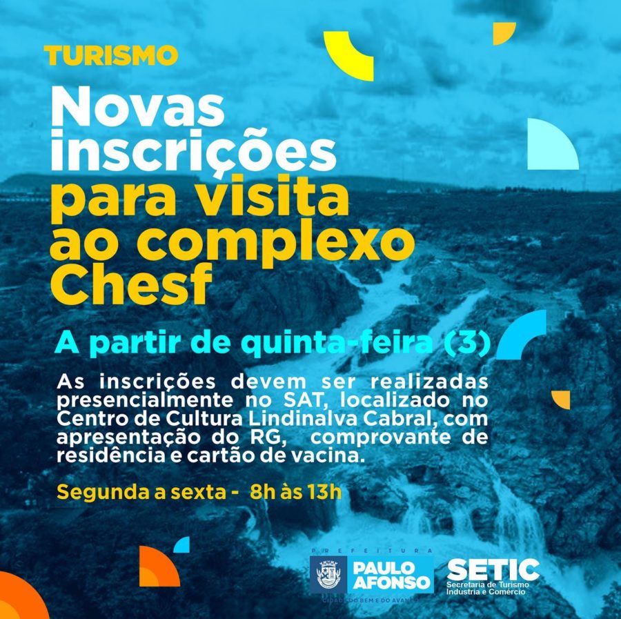 A Companhia Hidro Elétrica do São Francisco (Chesf), junto com a Prefeitura de Paulo Afonso, abre novamente nesta quinta-feira (3), as inscrições para a visitação ao complexo de usinas. No total, serão 40 vagas, em passeios realizados às 8h da manhã.