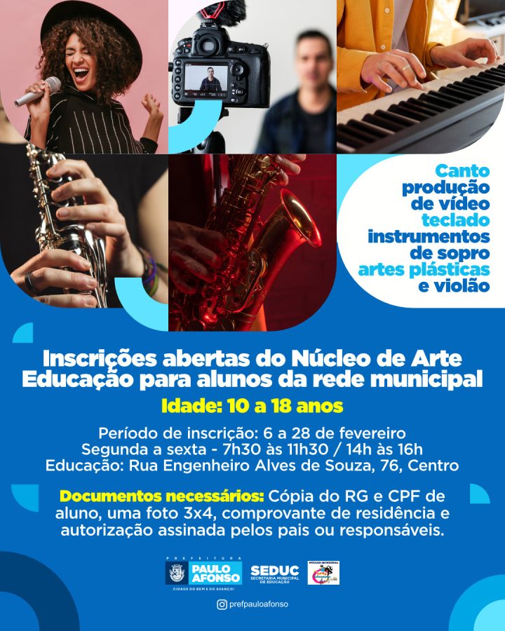 A Secretaria de Educação está com inscrições abertas para o Núcleo de Arte e Educação, com período até 4 de março. Serão disponibilizados os cursos de canto, teclado, artes plásticas, violão e instrumentos de sopro para os alunos da rede municipal, na faixa etária de 10 a 18 anos.