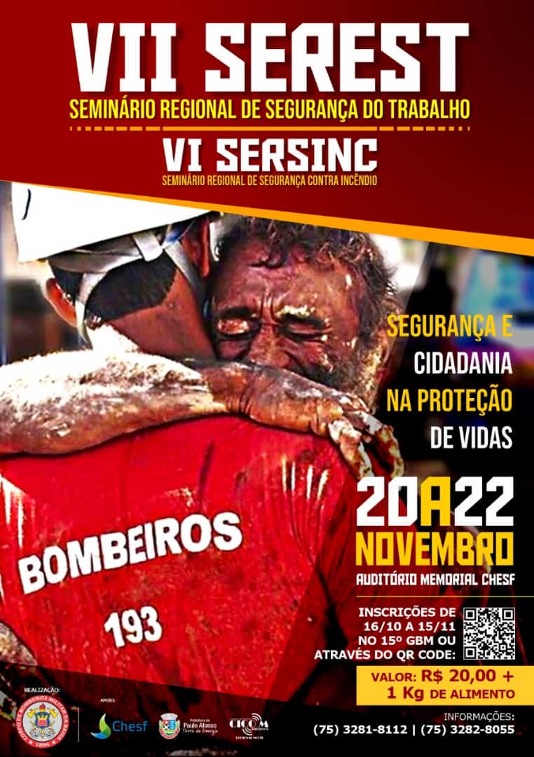 O 15° GRUPAMENTO DE BOMBEIROS MILITAR realizará nos dias 20, 21 e 22 de novembro, das 08h às 17h, no auditório do Memorial da Chesf – Paulo Afonso-BA, o VII SEREST – Seminário Regional de Segurança do Trabalho e VI SERSINC – Seminário Regional de Segurança Contra Incêndio.