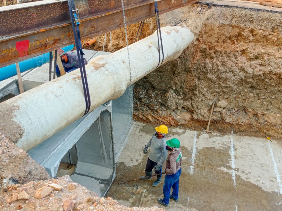 A obra já recebeu a fase da escavação anteriormente, nesse momento encontra-se na fase de colocação das aduelas de concreto, seguindo com a proteção dos taludes e por fim, a colocação do asfaltamento.