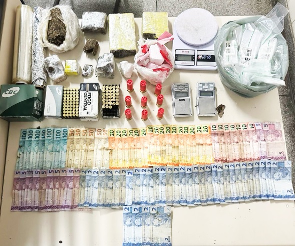 Ao diligenciar no local indicado, a equipe encontrou outro suspeito, que após ser questionado, confirmou as atividades ilícitas e permitiu o acesso à residência. Na busca, foram apreendidos diversos itens, incluindo substâncias análogas à maconha e cocaína, munições de vários calibres, balanças de precisão, dinheiro em espécie, além de itens relacionados ao tráfico de drogas e dois smartphones. Uma motocicleta Honda Titan 160 também foi apreendida.