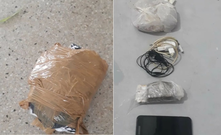 🔍 Após investigação, os policiais encontraram uma substância suspeita, similar a maconha, além de celulares, carregador e fones de ouvido dentro do pacote.