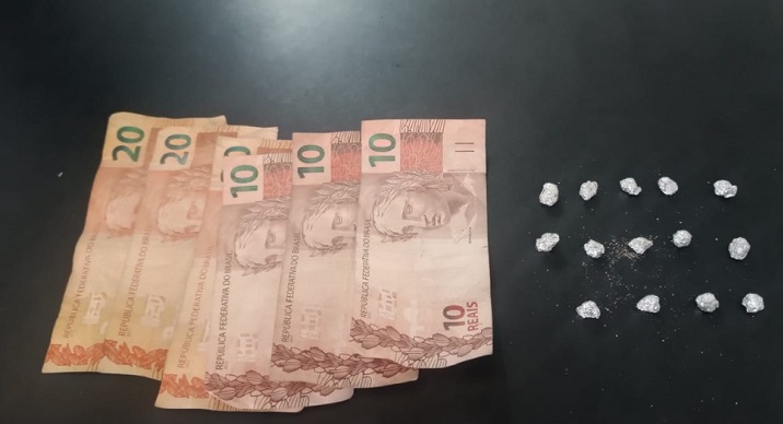 Ao chegar ao local, os policiais encontraram um suspeito com as características informadas. Ao perceber a presença policial, ele adentrou em uma residência conhecida pelo consumo de entorpecentes. No momento da abordagem, o indivíduo estava próximo a uma mulher, e foi localizado um pacote ao solo contendo diversas pedras análogas a crack.